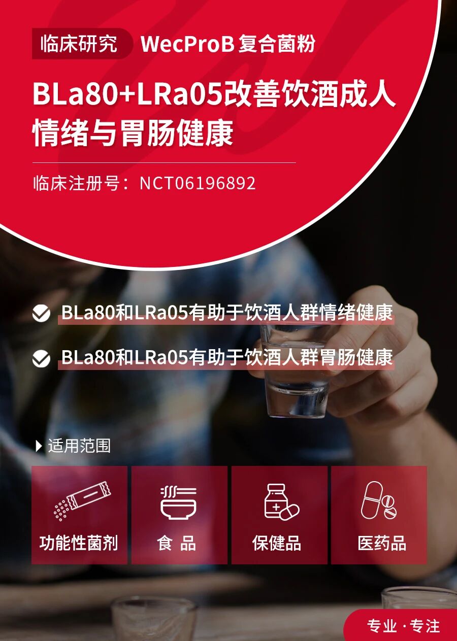 饮酒行为在现代社交生活中十分常见,但长期饮酒可能引发酒精依赖、胃肠功能紊乱和情绪波动等问题,进而影响整体健康。近年来,肠道菌群调控已成为改善代谢和胃肠功能的新兴策略。研究表明,特定益生菌能够通过调节肠道微生态,辅助肝脏代谢,减轻酒精引起的胃肠道不适,并对情绪产生积极影响。经临床验证,微康益生菌组合—WecProB( 动物双歧杆菌乳亚种BLa80与鼠李糖乳酪杆菌LRa05)能够有效支持饮酒人群的情绪健康与消化道功能,为饮酒成人提供了一种可行的微生态干预方案。